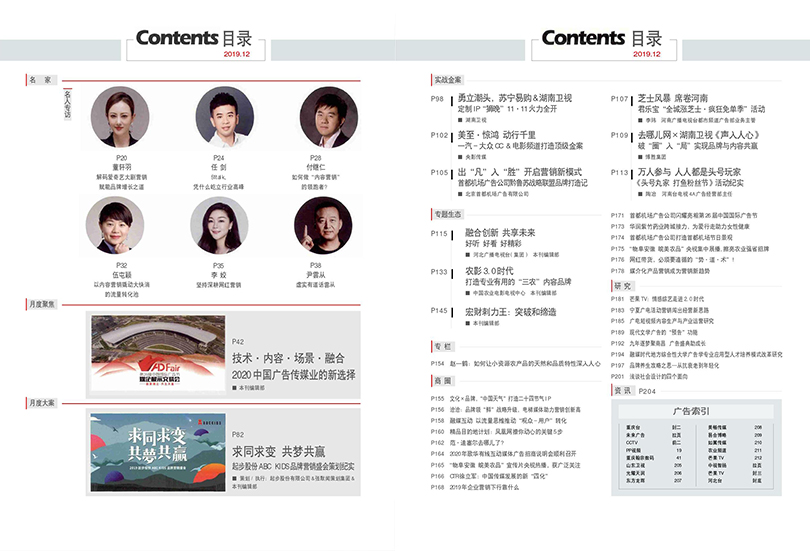 主要栏目:金口玉言、木已成舟、水到渠成、火树银花、土固枝荣、月度大案、月度聚焦、名人写名人、广告主、媒体等。